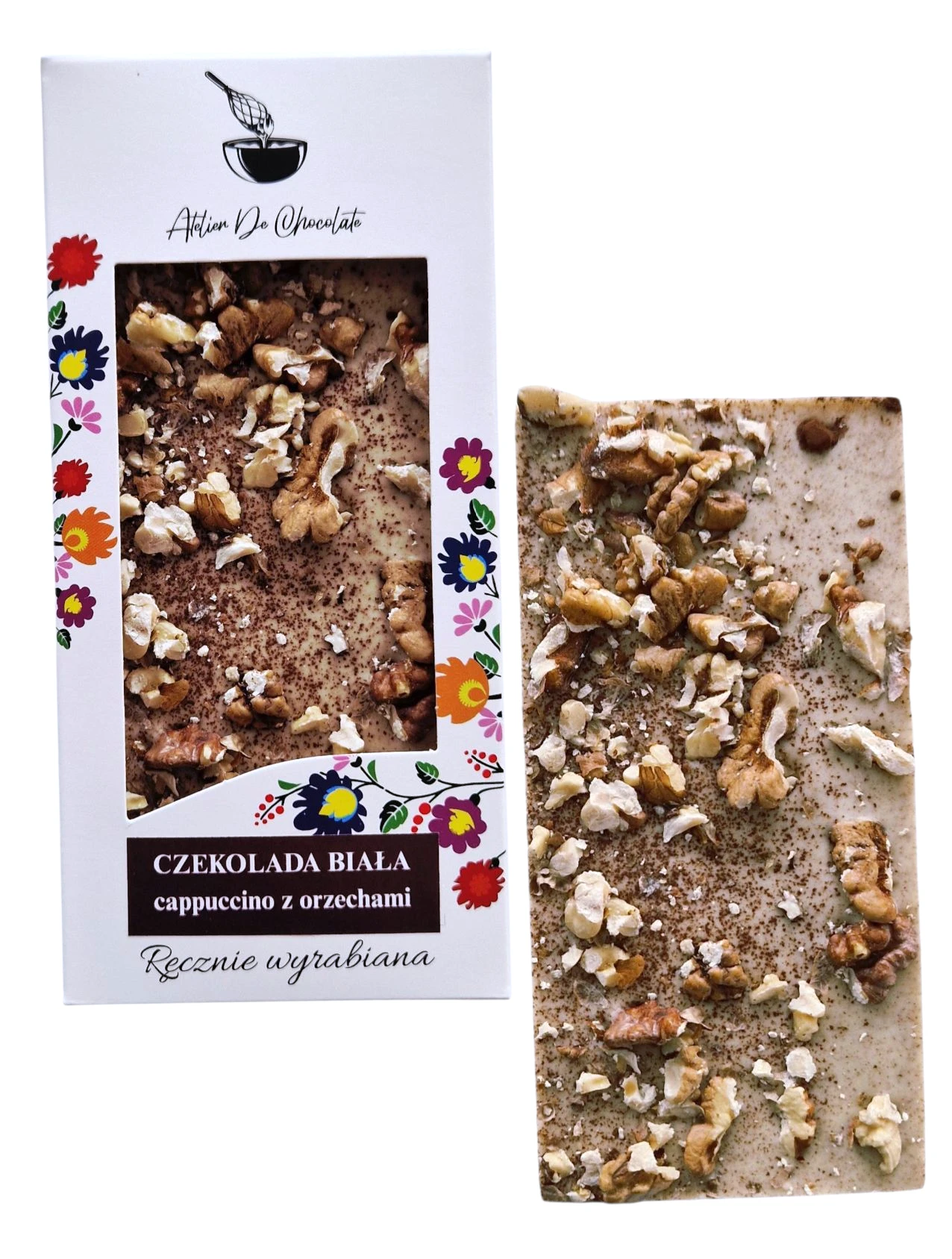 Czekoladę białą cappuccino z orzechami lubią chyba wszyscy :) kremowo-śmietankowy smak kawy, z dodatkiem orzechów włoskich i delikatną nutą kakao. Pobudza, daje energię, poprawia nastrój. Wszystko czego nam trzeba!