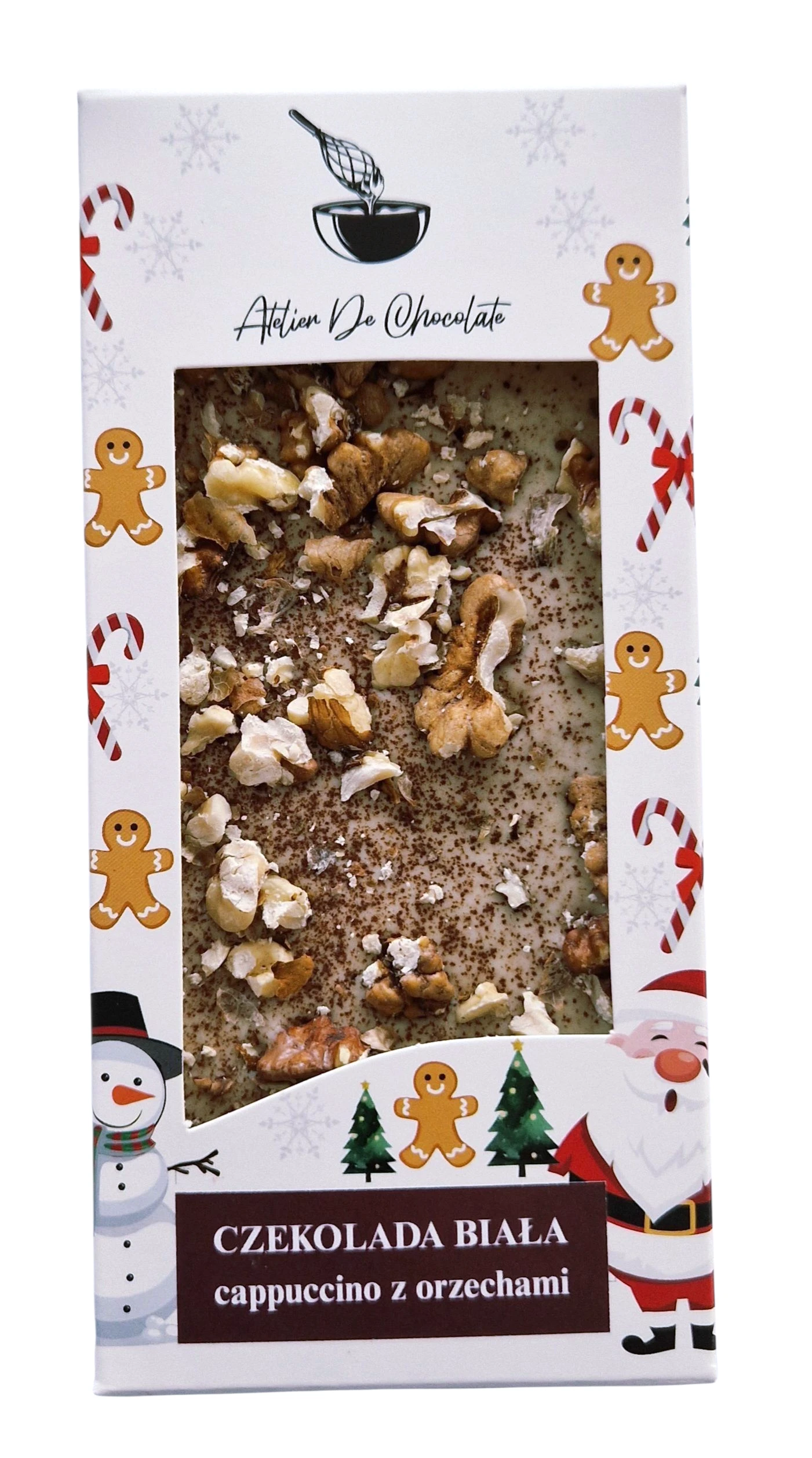 Składniki: czekolada biała: [cukier, tłuszcz kakaowy; MLEKO pełne w proszku; emulgator: lecytyna SOJOWA; naturalny aromat waniliowy], ORZECHY WŁOSKIE (10%), kawa rozpuszczalna (1%), kakao (0,01%).