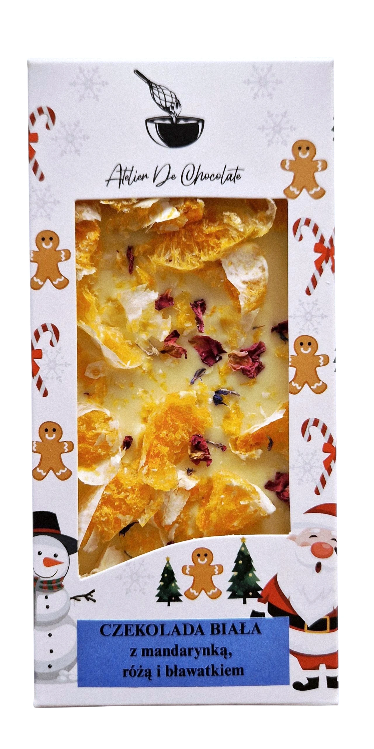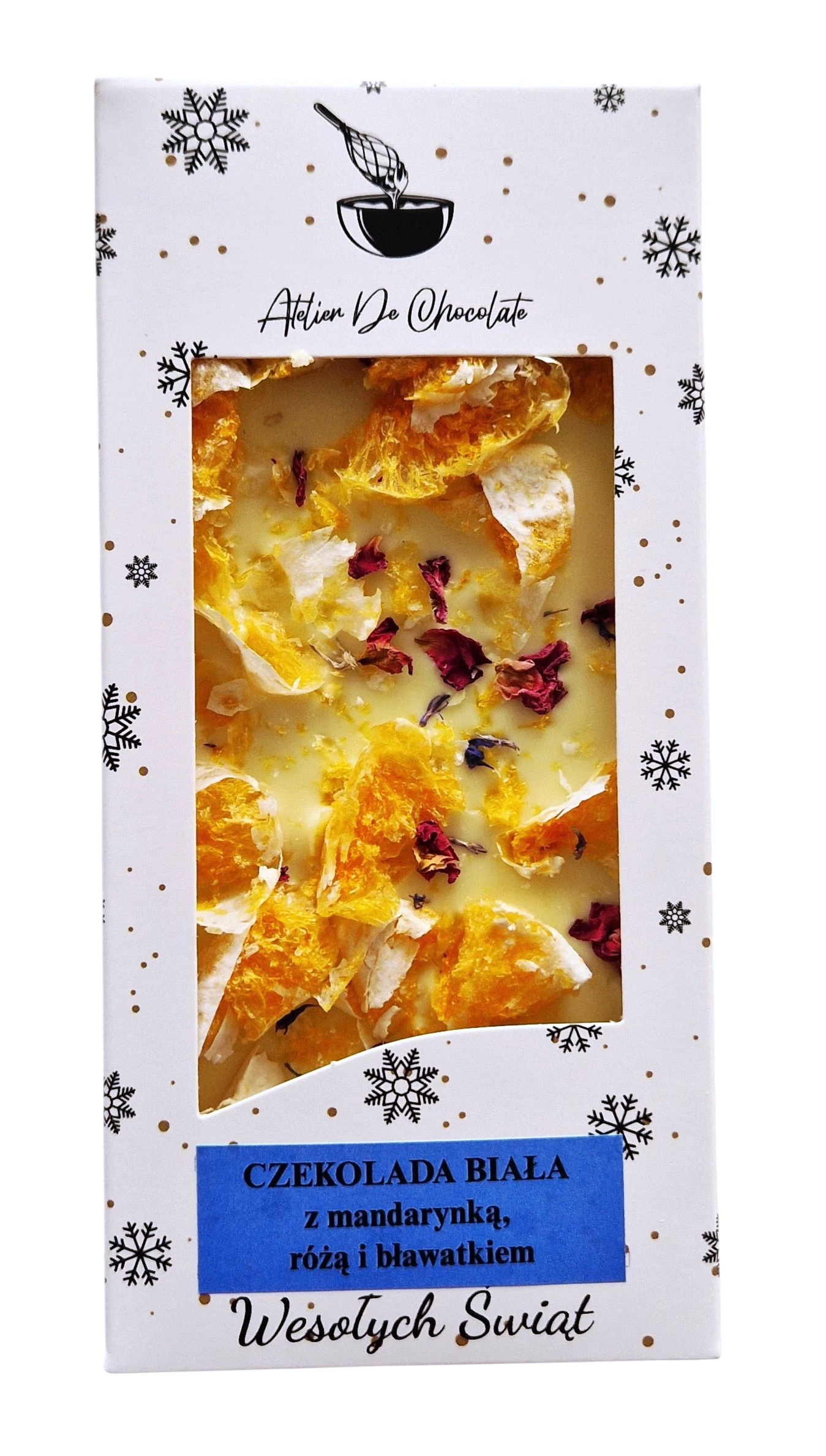 Wysokiej jakości biała czekolada, delikatnie kremowa w smaku, z nutą wanilii. Umiarkowanie słodka. Dodatek słodkiej mandarynki połączony z płatkami róży i bławatka daje nam cudowne połączenie, nie tylko smakowe, ale także wizualne.