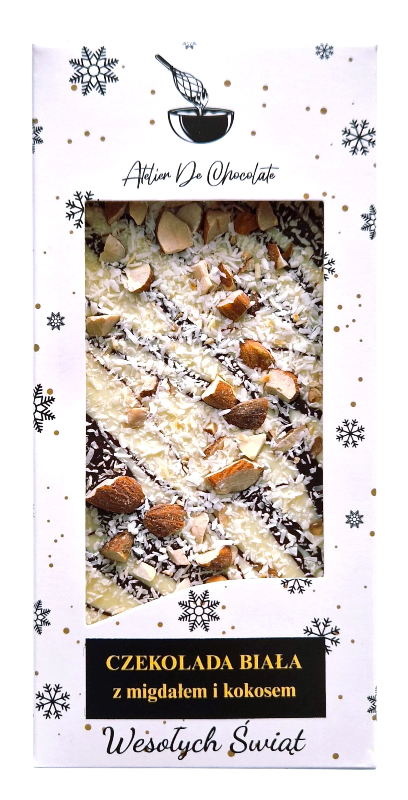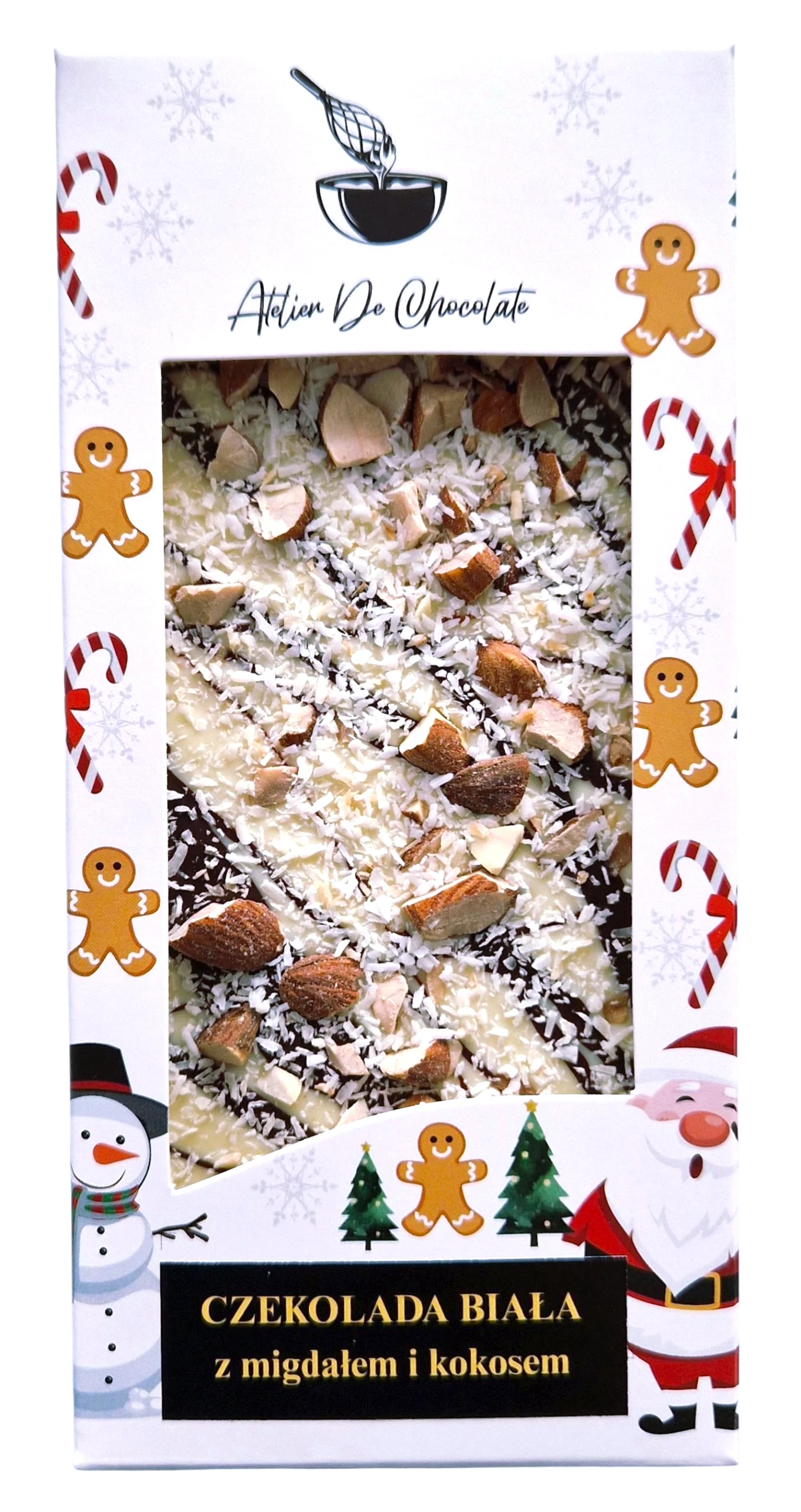 Składniki: czekolada biała: [cukier, tłuszcz kakaowy; MLEKO pełne w proszku; emulgator: lecytyna SOJOWA; naturalny aromat waniliowy]; czekolada ciemna: [miazga kakaowa; cukier; tłuszcz kakaowy; emulgator: lecytyna SOJOWA; naturalny aromat waniliowy]; MIGDAŁ (3,5%); kokos (2,3%).