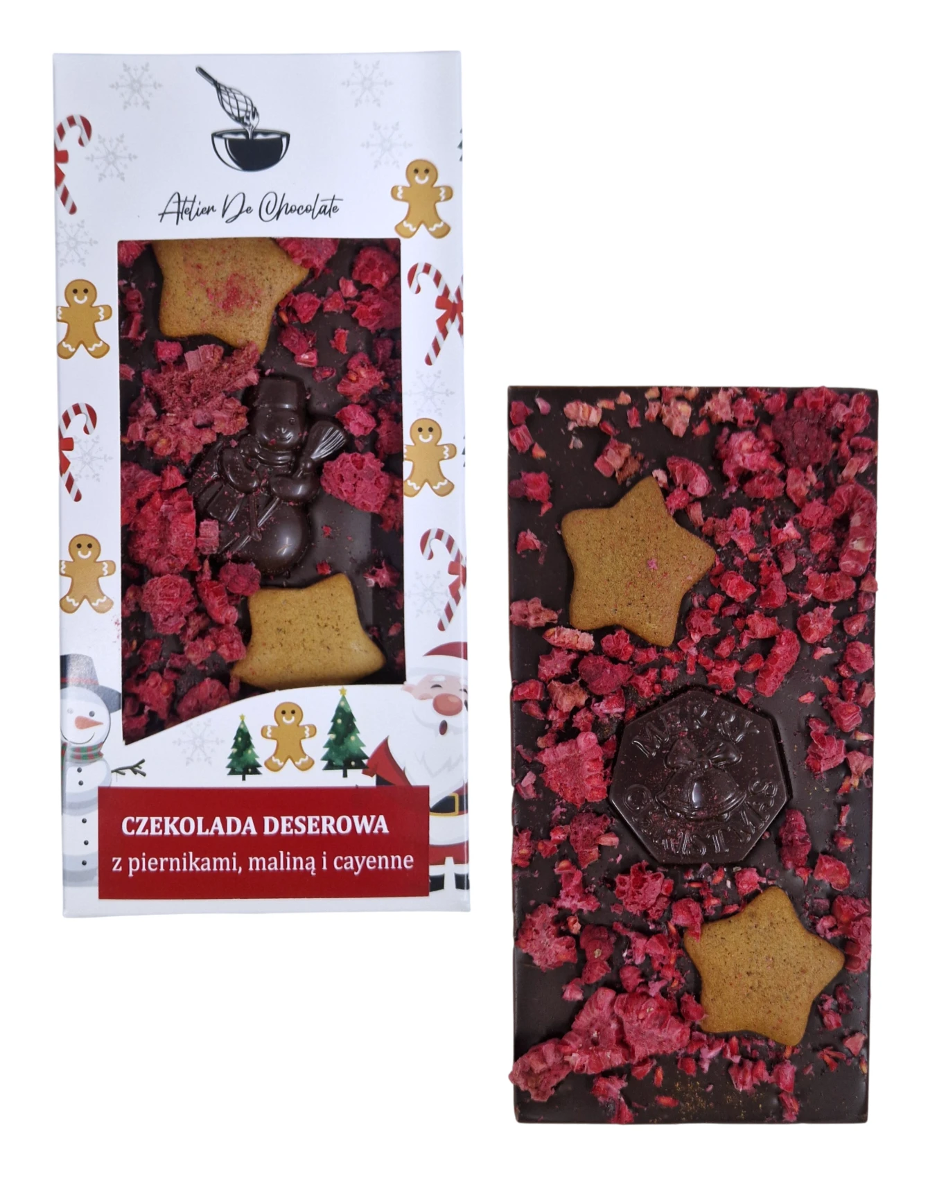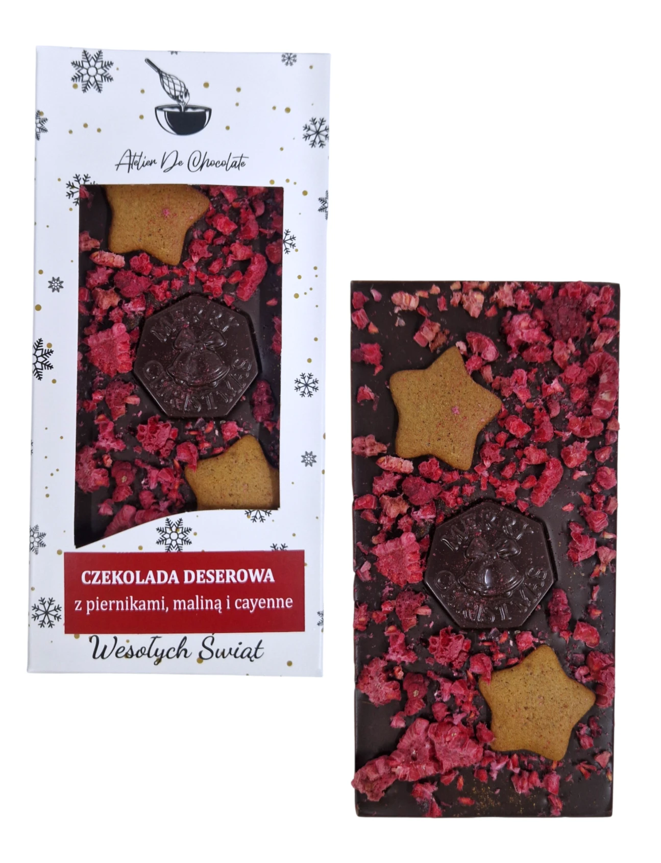 Składniki: czekolada deserowa: [miazga kakaowa, cukier, tłuszcz kakaowy, emulgator: lecytyna SOJOWA, naturalny aromat waniliowy], pierniczki (2%): [mąka PSZENNA, miód, cukier brązowy, masło: (ŚMIETANKA pasteryzowana z MLEKA), JAJA, przyprawa: (cukier, cynamon 15%, goździki, kakao, owoc kolendry, ziele angielskie, gałka muszkatołowa)]; malina liofilizowana (1,5%), pieprz cayenne (0,01%).