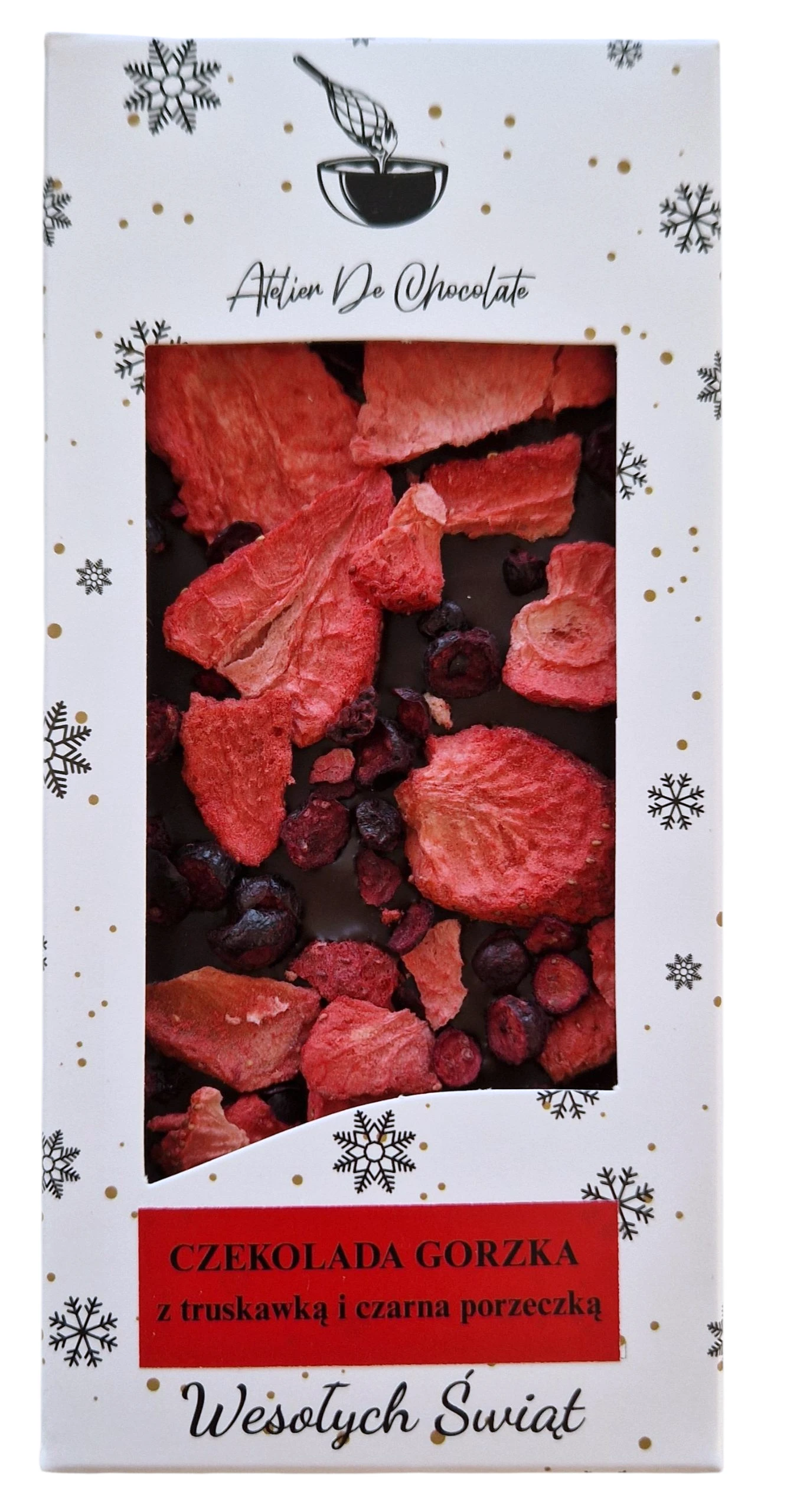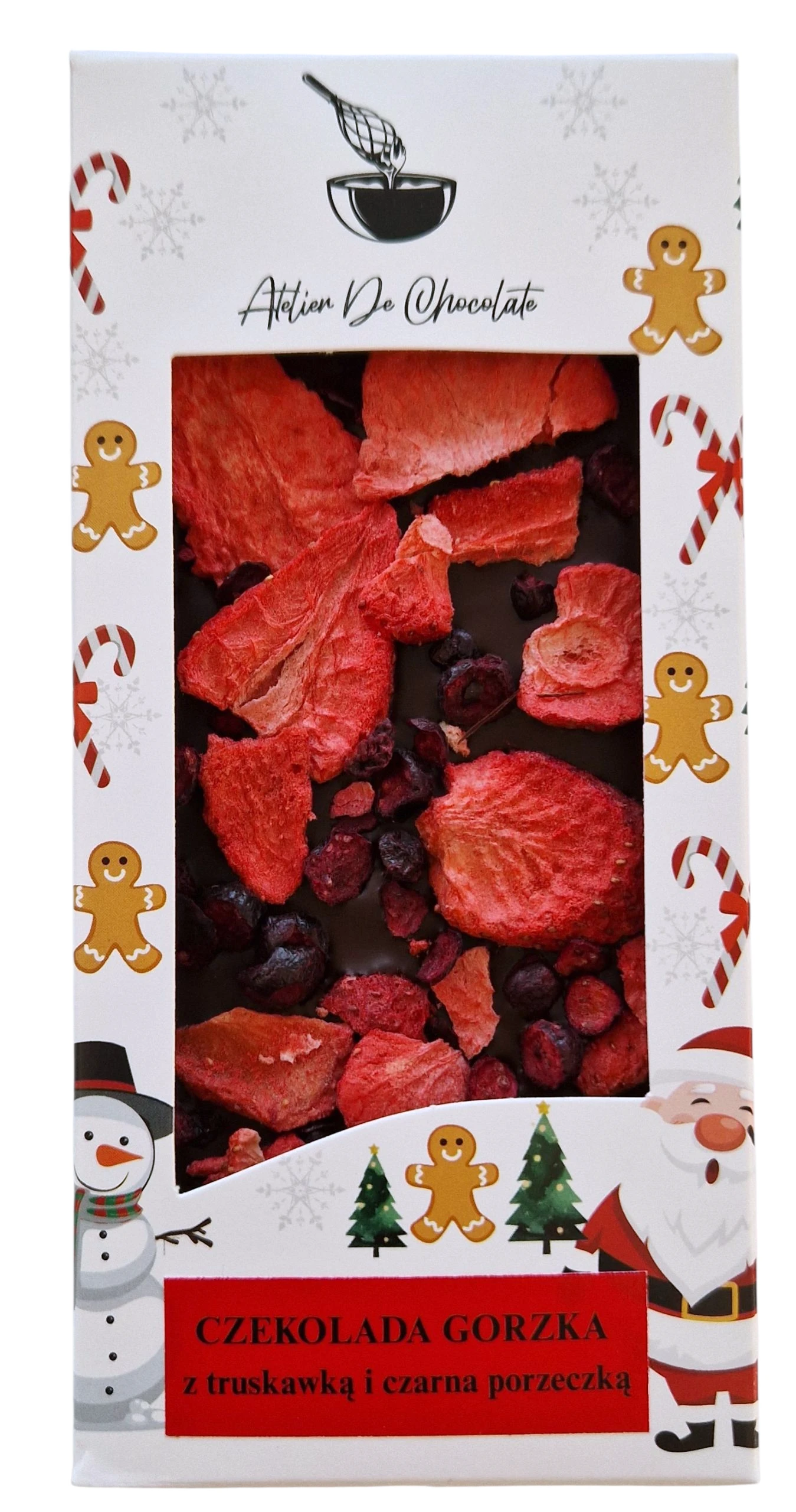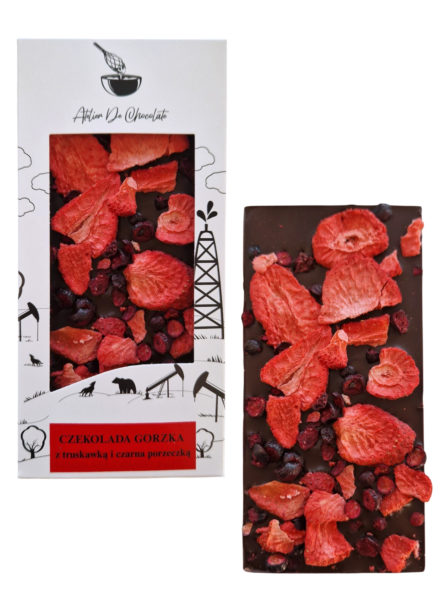 Składniki: czekolada gorzka: [miazga kakaowa; cukier; proszek kakaowy o obniżonej zawartości tłuszczu; lecytyna SOJOWA; naturalny aromat waniliowy], truskawka liofilizowana (1,7%); czarna porzeczka liofilizowana (1,1%).