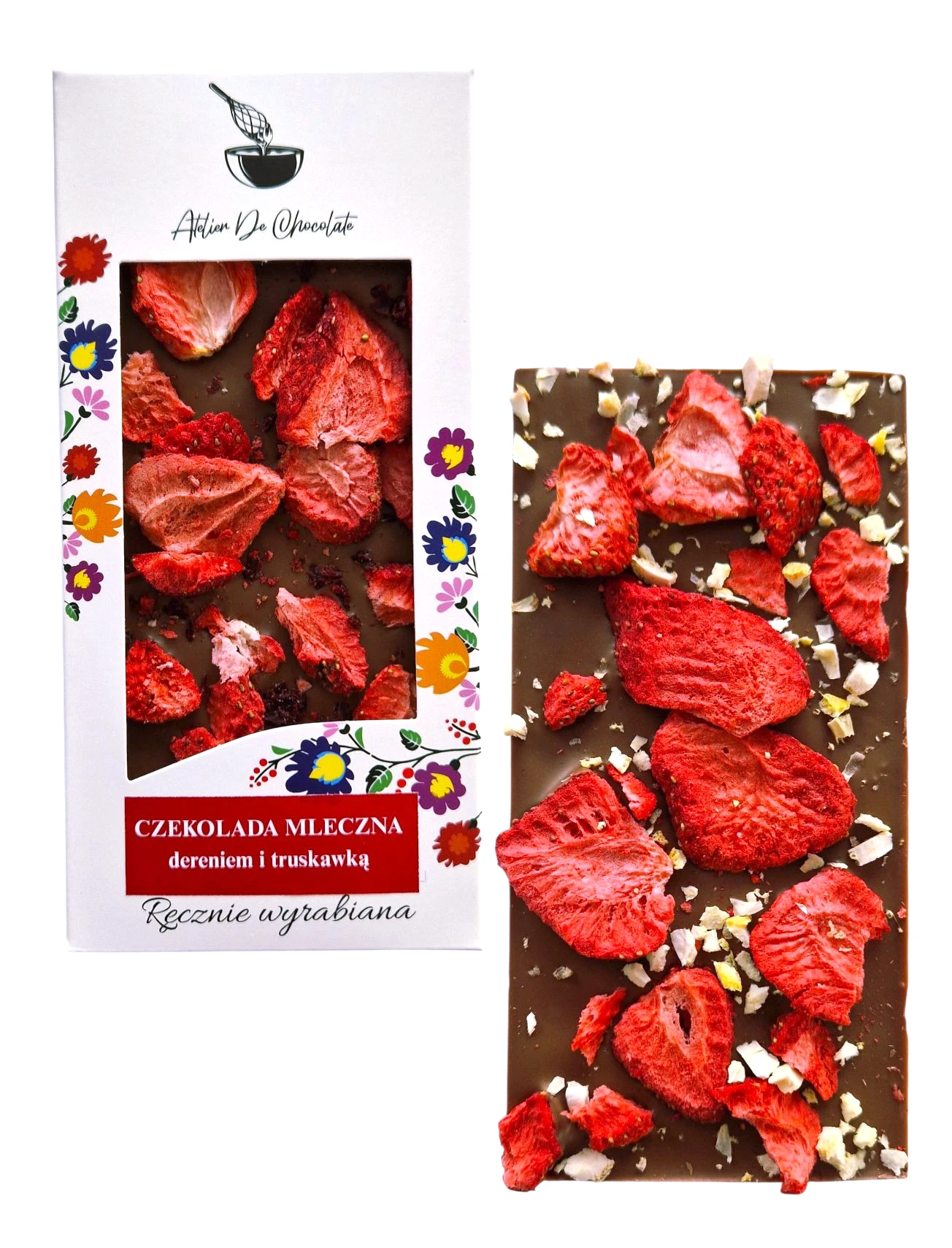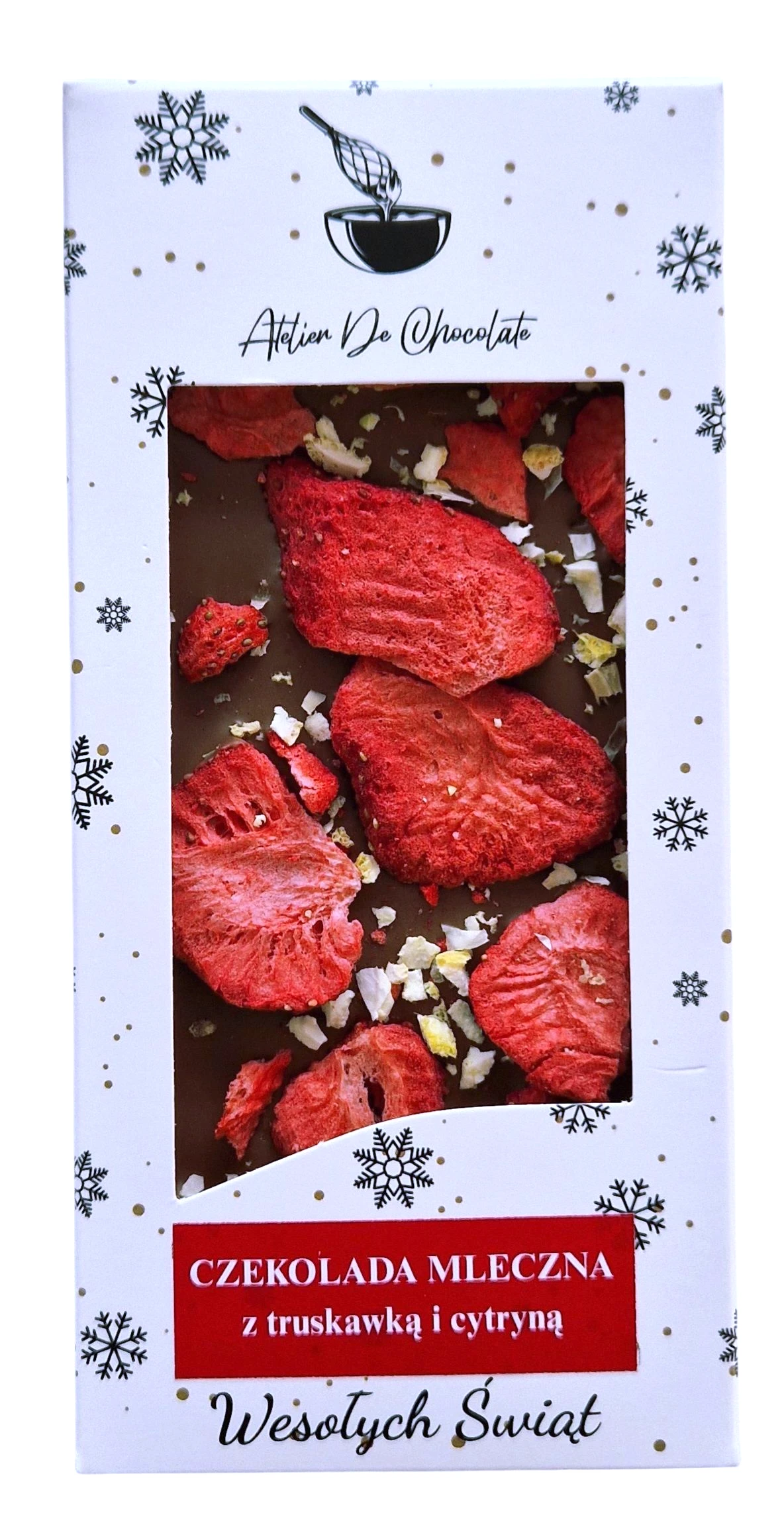 Delikatna mleczna czekolada kremowa, gładka, aromatyczna, z nutami wanilii, połączona z truskawką i cytryną przypomni nam smak lata w każdej chwili.