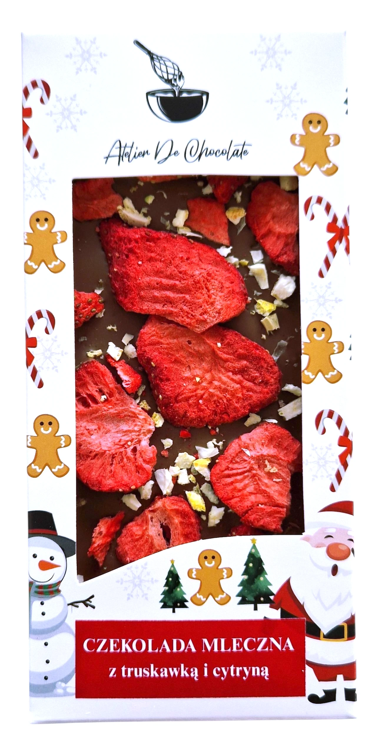 Składniki: czekolada mleczna: [cukier; tłuszcz kakaowy; MLEKO pełne w proszku; miazga kakaowa; emulgator: lecytyna SOJOWA; naturalny aromat waniliowy], truskawka liofilizowana (3,5%), cytryna liofilizowana (1,1%).