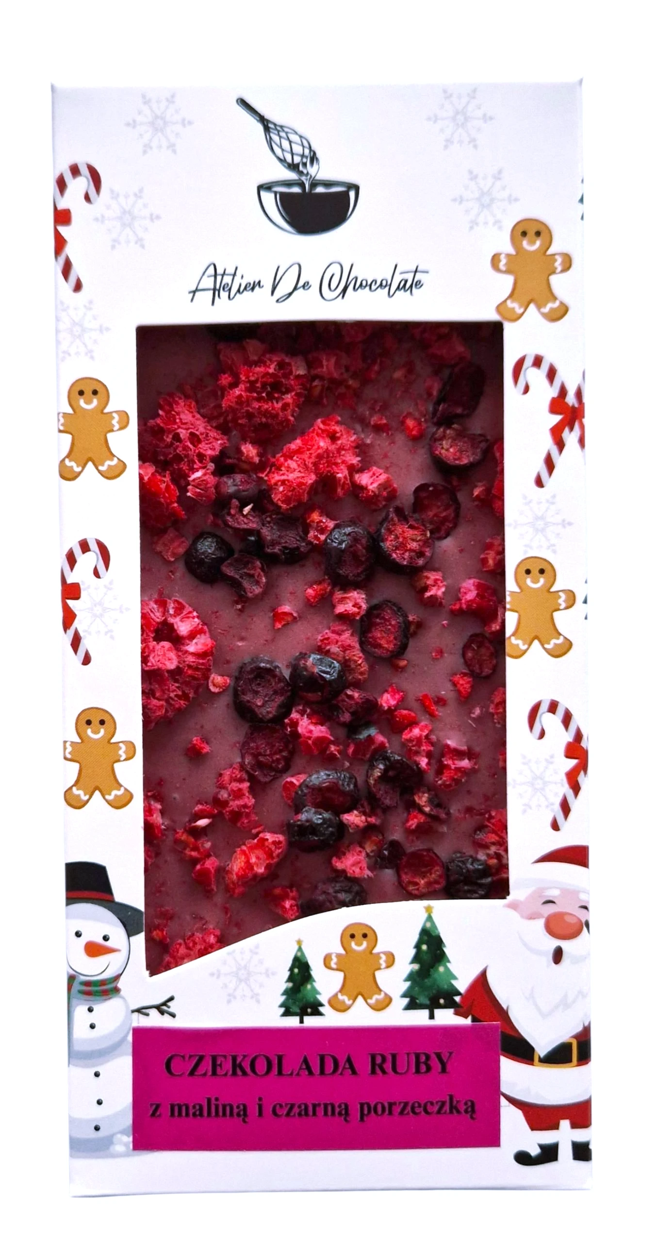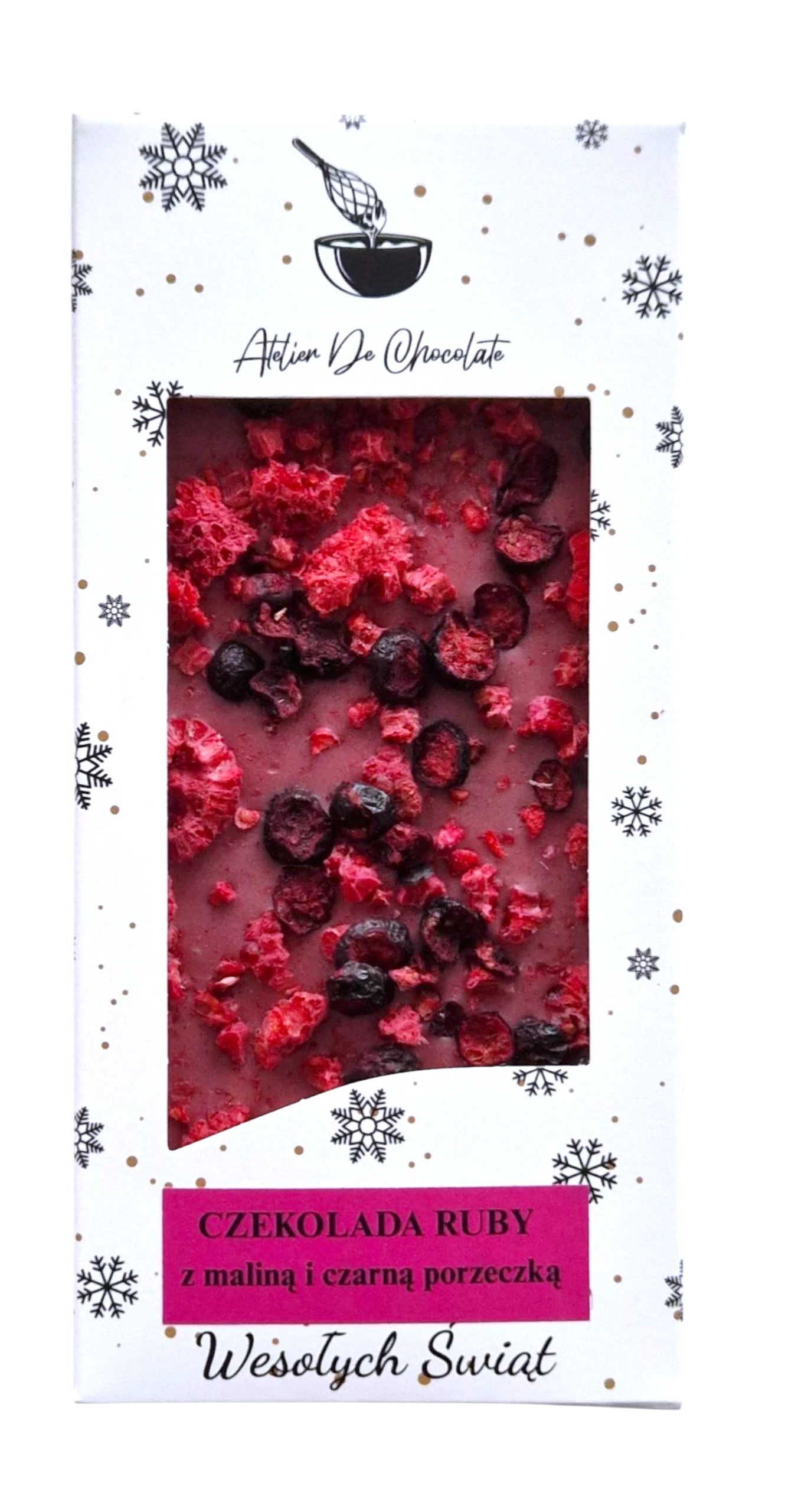 Składniki: czekolada ruby: [cukier, tłuszcz kakaowy, MLEKO odtłuszczone w proszku, MLEKO pełne w proszku, miazga kakaowa, emulgator: lecytyna SOJOWA, kwas: kwas cytrynowy; naturalny aromat waniliowy], malina liofilizowana (3,5%), czarna porzeczka liofilizowana (1,1%).